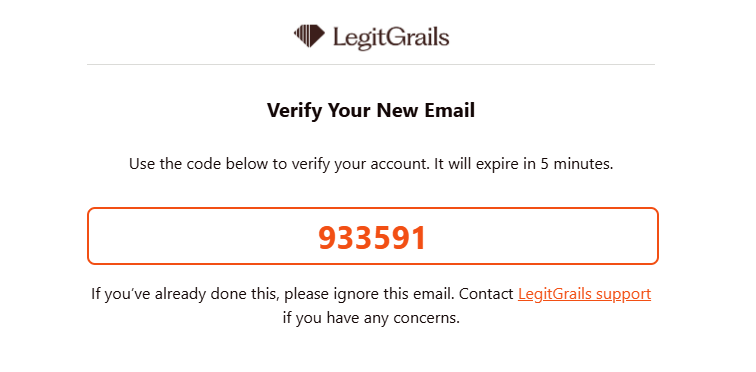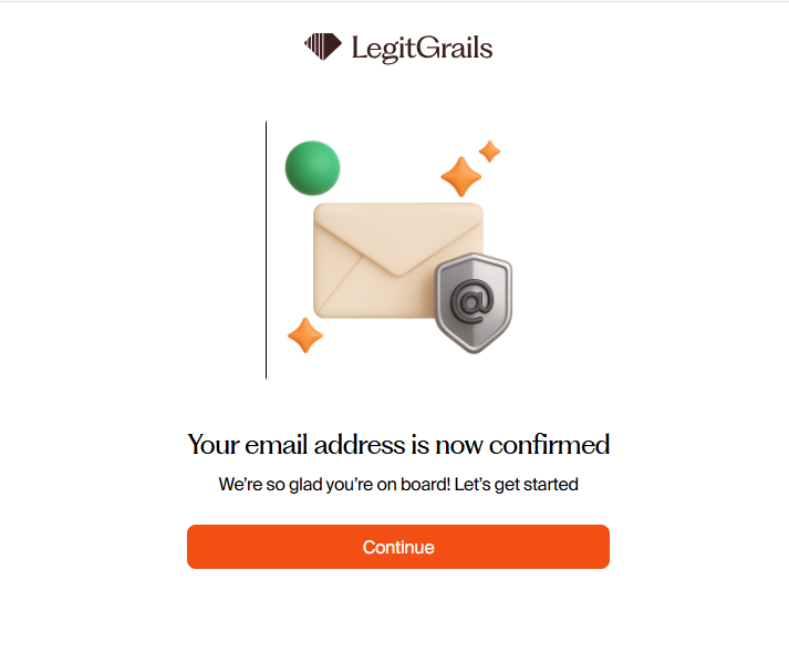 If you cannot find the letter, please check your Spam/Junk folder. If the email didn't reach you, don't hesitate to contact our support team at support@legitgrails.comAfter inputting the code, the "Email Confirmed" screen: