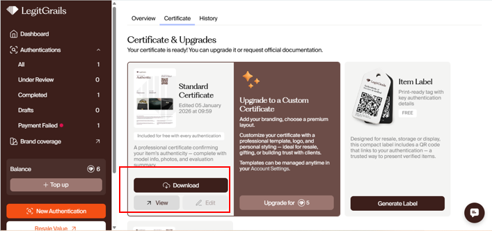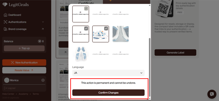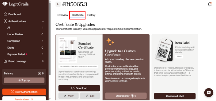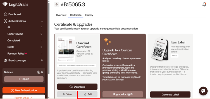 Certificates are issued automatically for the outcomes "authentic" & "fake". After the authentication process has been completed, you can proceed to the customization details. Choose carefully, as you will not be able to edit the certificate's appearance after it is generated.