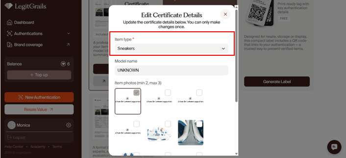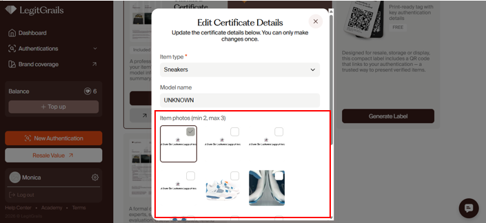 In the "Edit" window, enter the correct model name, select the item type, and choose 2 photos you want to display on the certificate. If you only want to change one of the fields, leave the rest as they are.