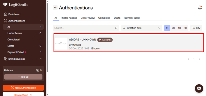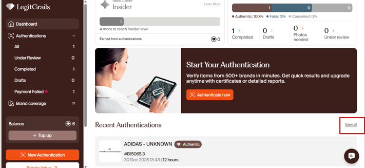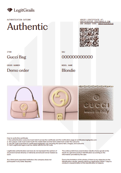 After our team of authenticators completes the evaluation of your item, you will be notified of the verdict via email, and the result will be visible on your dashboard after you log in. For "Fake" and "Authentic" outcomes, you can receive a LegitGrails authenticity certificate — a file that contains the main information about the submitted item and our verdict.
