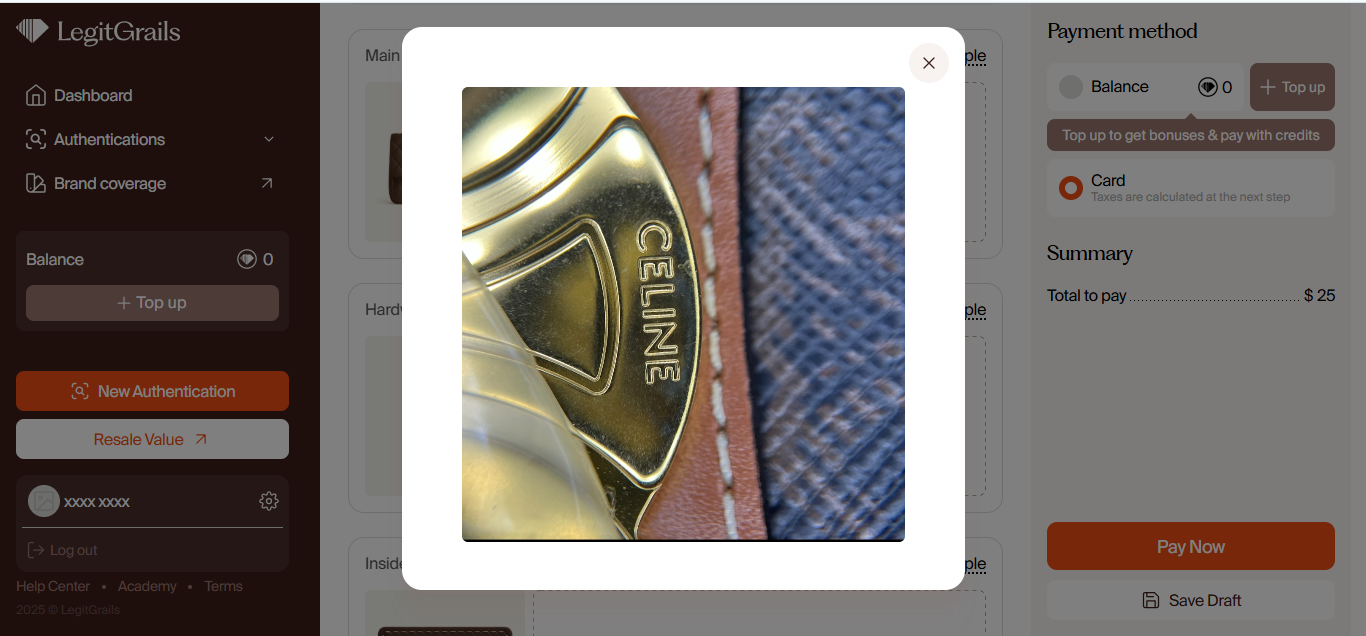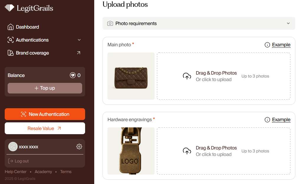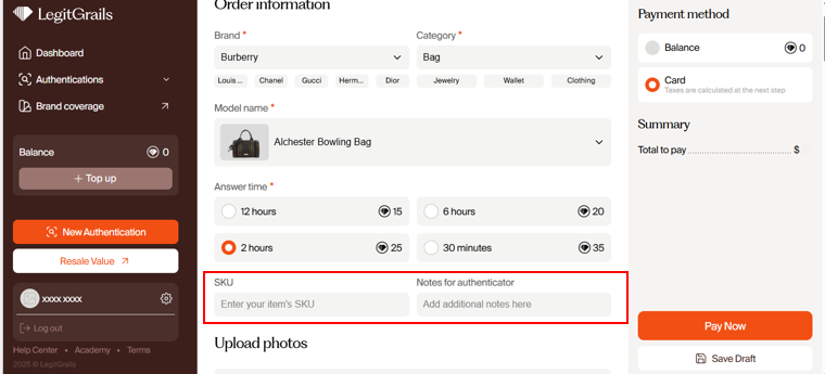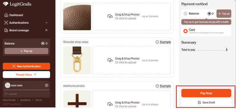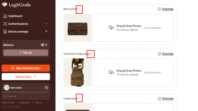 Ensure you add the required photos to the item details marked with an asterisk (*) in the top corner—without them, authentication may not be possible.